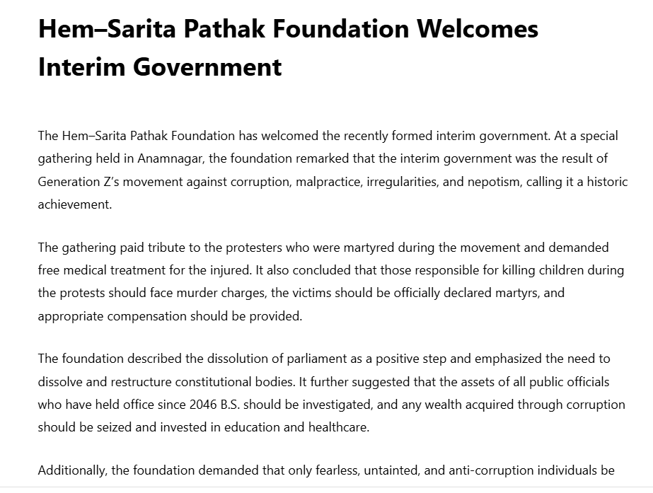 The Hem–Sarita Pathak Foundation has welcomed the recently formed interim government. At a special gathering held in Anamnagar, the foundation remarked that the interim government was the result of Generation Z’s movement against corruption, malpractice, irregularities, and nepotism, calling it a historic achievement.